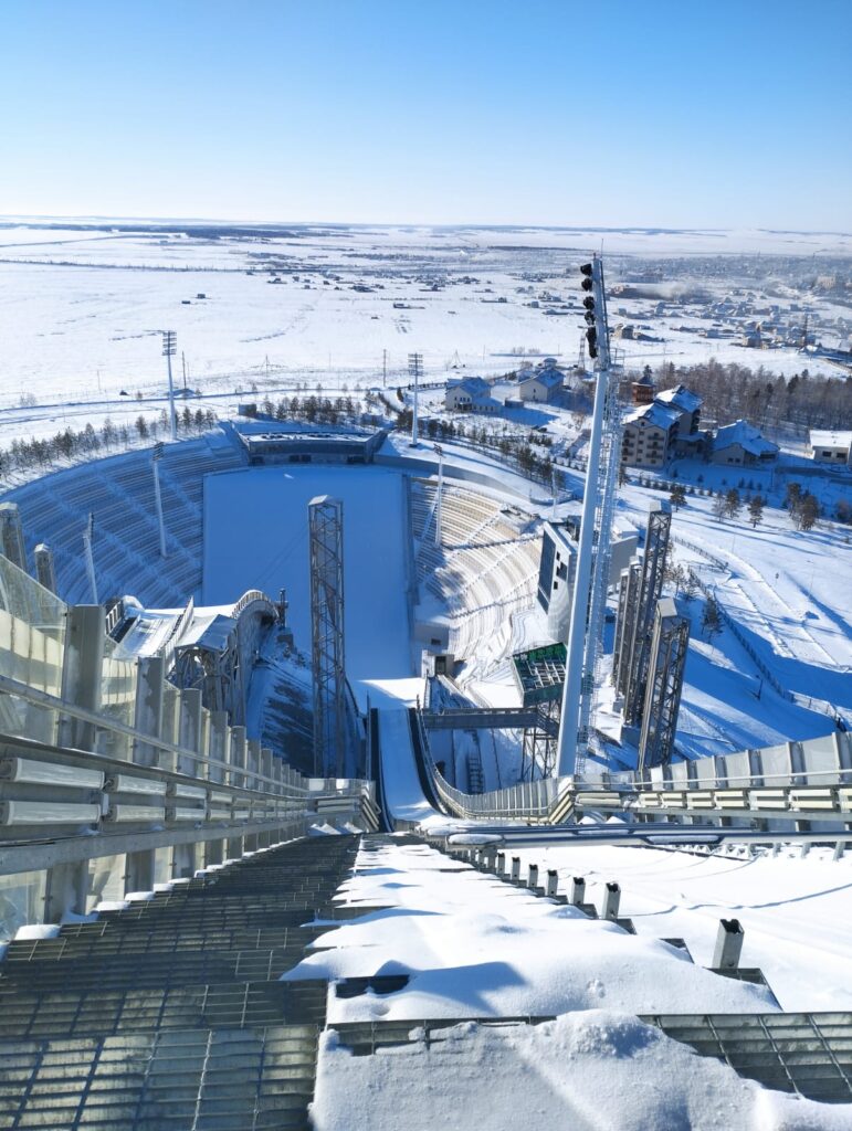 It is as though it has landed from outer space or been left over from a SciFi movie Buy the tower is not a launch pad to the stars but is a launch pad for olympic stars – aspiring olympic ski jumpers from all over the world come to the small city of Schuchinsk in the north of Kazakhstan to hone their ‘flying skills’!