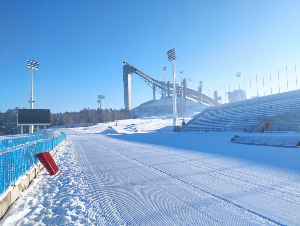 To compete with its European alternatives they have added a ski trampoline. It includes K-90 and K-125 launch platforms, an 82-metre tower, judging tower with panoramic view, 10,000-spectator arena, cable car rail, doping control centre and medical centre.